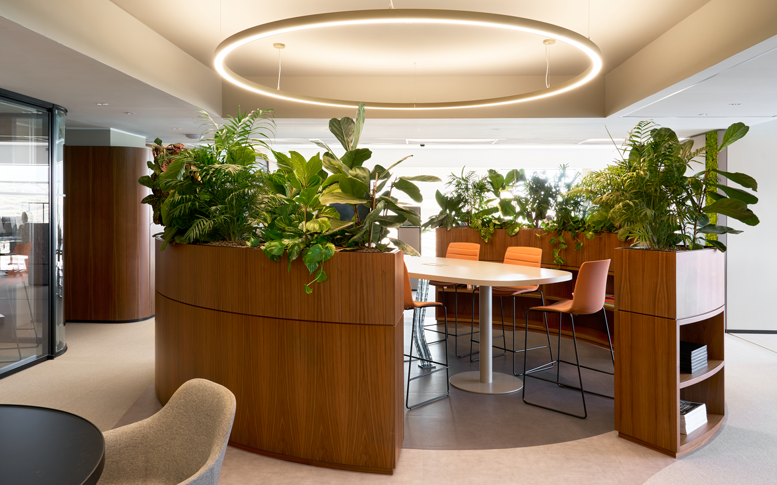 Special attention was given to the integration of greenery within the interior spaces, with the inclusion of lockers featuring real plants and a MOSSwall® installation — elements that bring freshness and vitality, transforming the office into an inspiring and welcoming place.