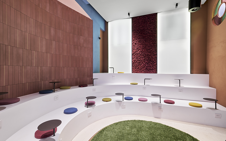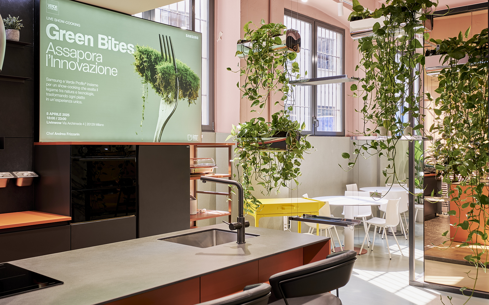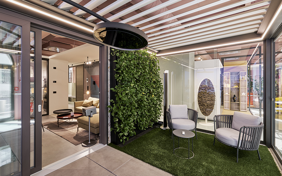 The result is an immersive showroom where greenery becomes the true protagonist of the experience.