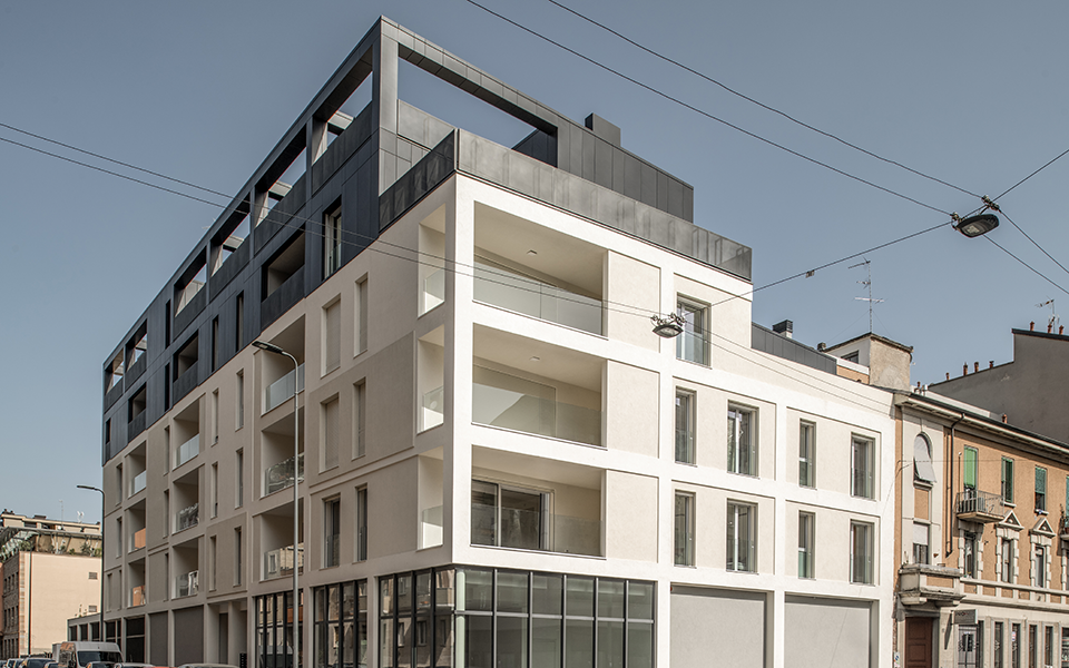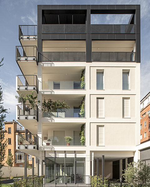 The MINAVIGLI – Green Apartments project features a five-story residential building with 20 apartments organized around an inner garden.