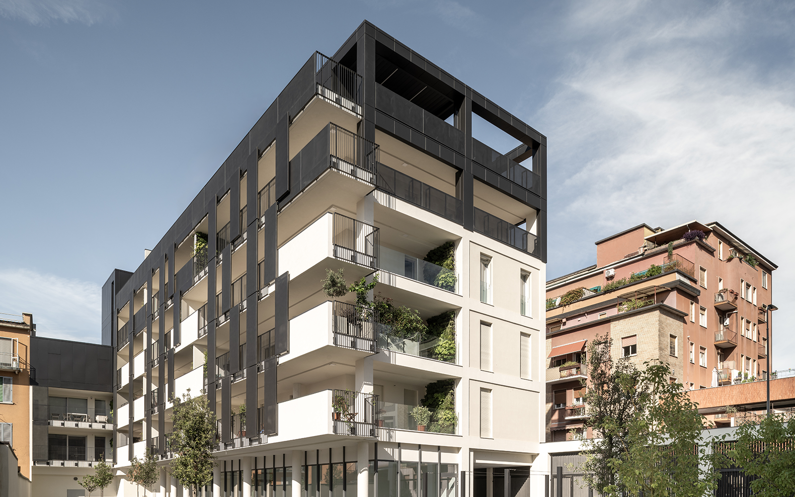 The multiplicity of green façades overlooking the courtyard generates welcoming outdoor lounges—true suspended living rooms—that extend the interiors and are distinguished by their dedicated materials and finishes.