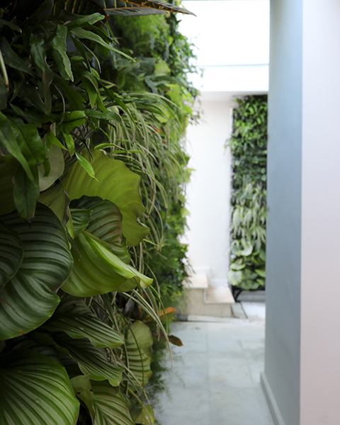 Indoors, bright open spaces highlight views of the vertical greenery, creating visual and sensory continuity.