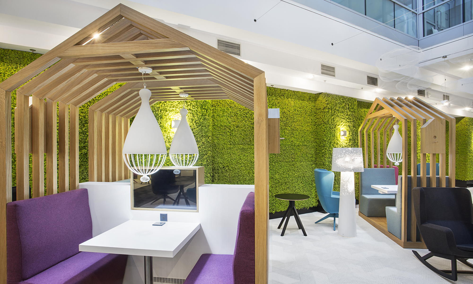 The installation spans two floors, featuring a relaxation area and a workspace equipped with smart walls and MOSSwall® partitions.