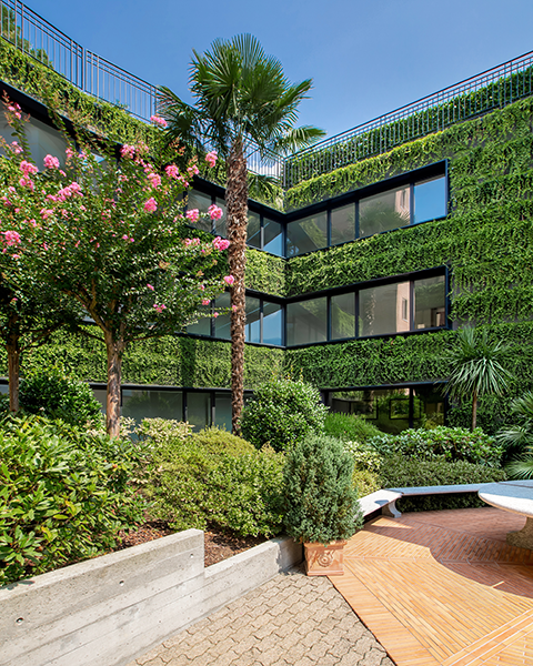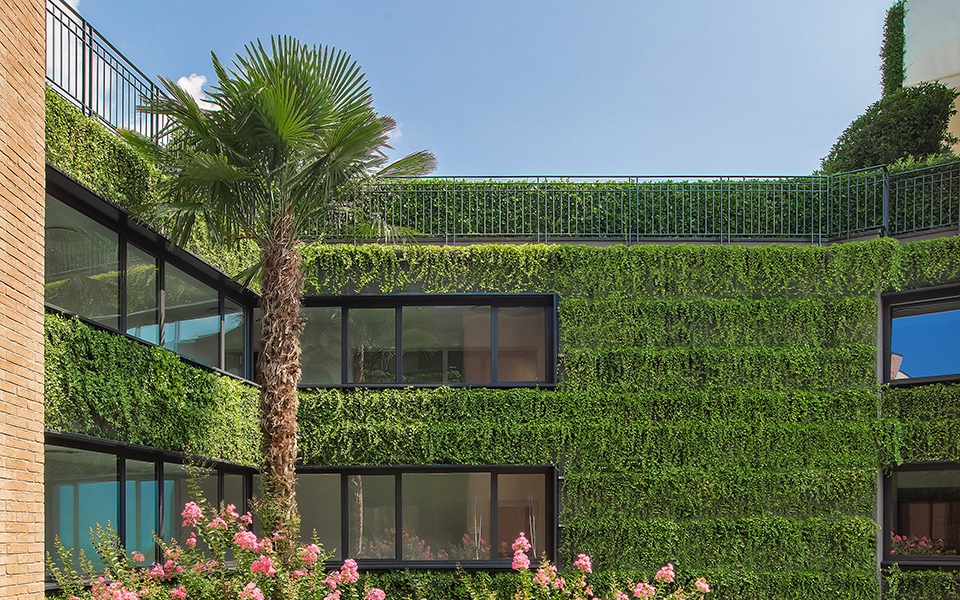 L’intero edificio è stato rivestito da una copertura verde continua, trasformandolo in un esempio virtuoso di architettura sostenibile.