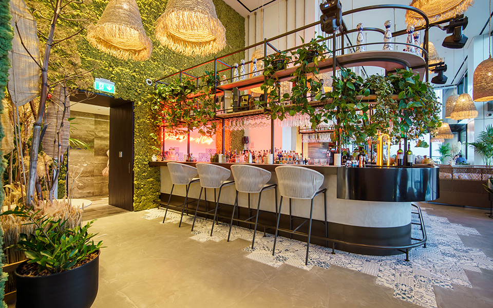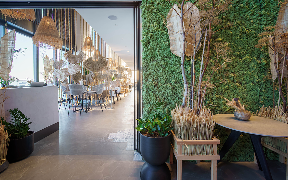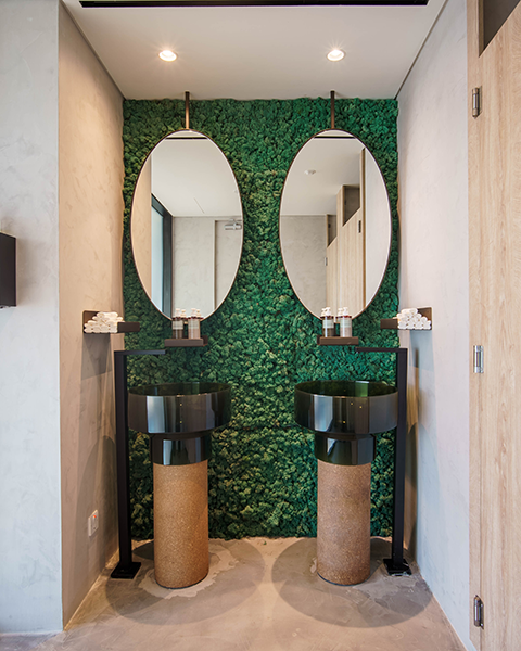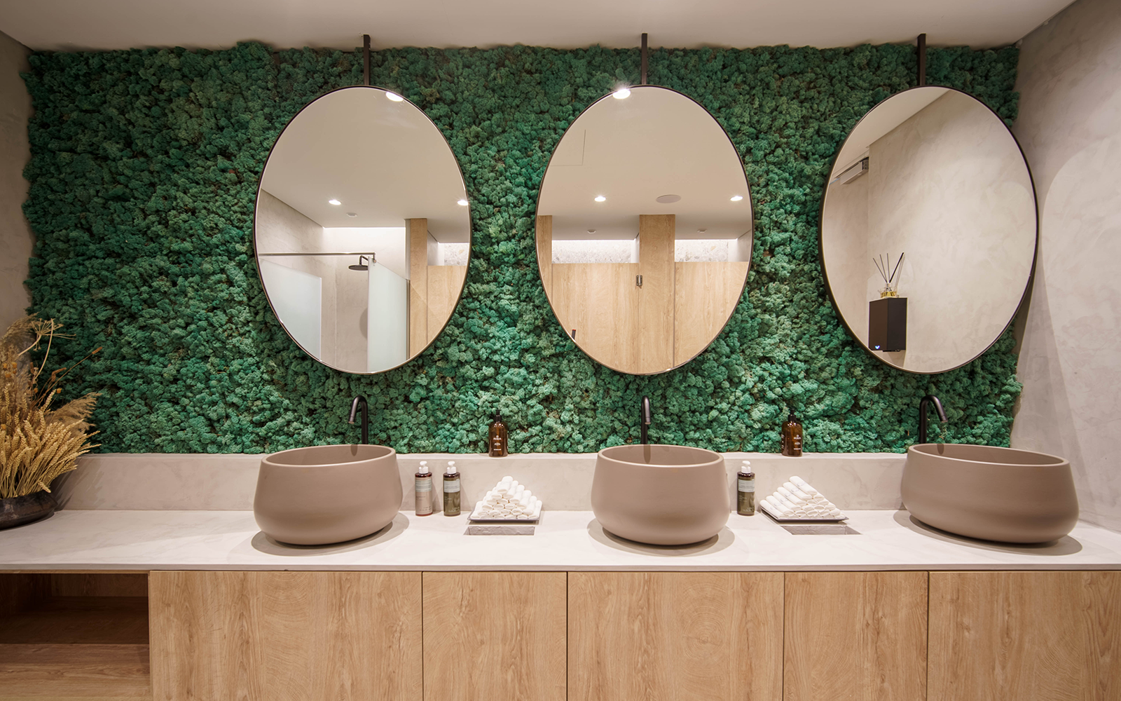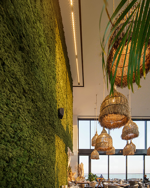 Attraverso l’utilizzo di MOSSwall®, la tecnologia che integra il muschio stabilizzato nelle superfici verticali, abbiamo creato un’ambientazione distintiva e immersiva. Il verde intenso del MOSSwall® avvolge la parete del bar, donando profondità e carattere all’ambiente e contribuendo a un’atmosfera vivace e dinamica, ideale per socializzare e assaporare proposte gastronomiche d’eccellenza.